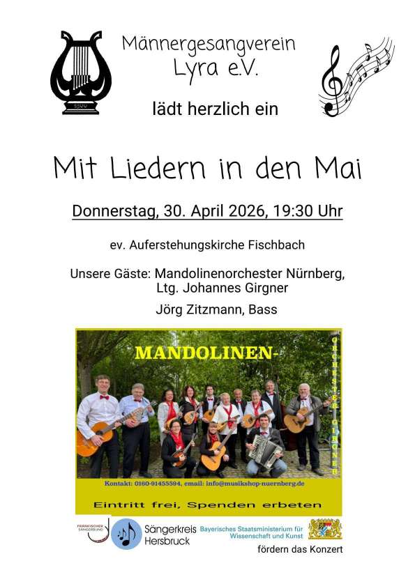 Als Gäste wirken in diesem Jahr das Mandolinenorchester mit klassischen, traditionellen und populären Stücken mit und werden mit ihren Beiträgen die Lieder des Männergesangvereins ergänzen. Damit kann am 30. April um 19.30 Uhr den Besuchern ein abwechslungsreiches Programm in der ev. Kirche in Fischbach dargeboten werden.